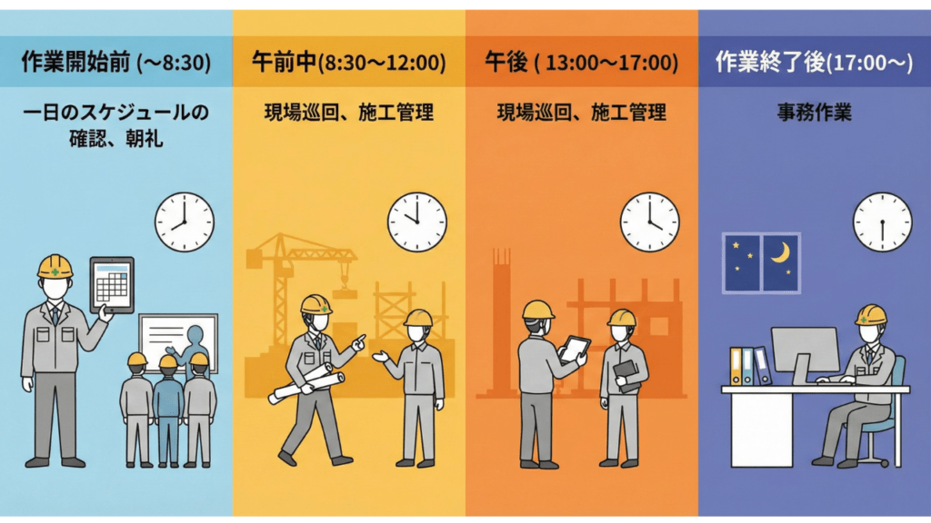 施工管理の仕事は、現場の状況や担当する業務によって、1日のスケジュールが大きく変わります。そのため、状況に応じた柔軟な対応が求められると言えるでしょう。