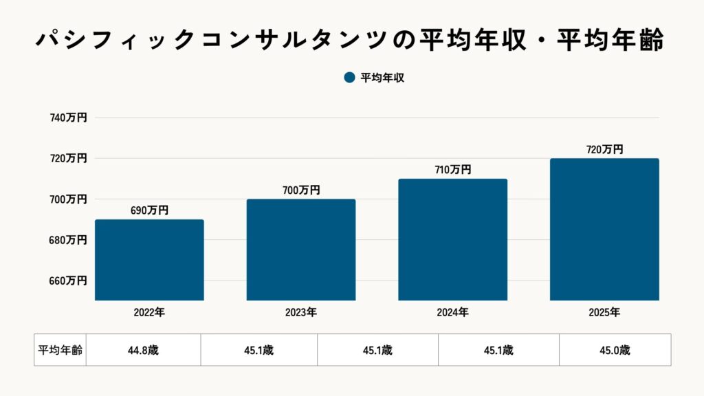 パシフィックコンサルタンツは非上場企業のため、有価証券報告書での年収公開はありません。そこで初任給(学部卒25.8万円)・賞与水準・複数の口コミデータをもとに独自推計すると、平均年収は約720万円(平均年齢45.0歳)と試算されます。