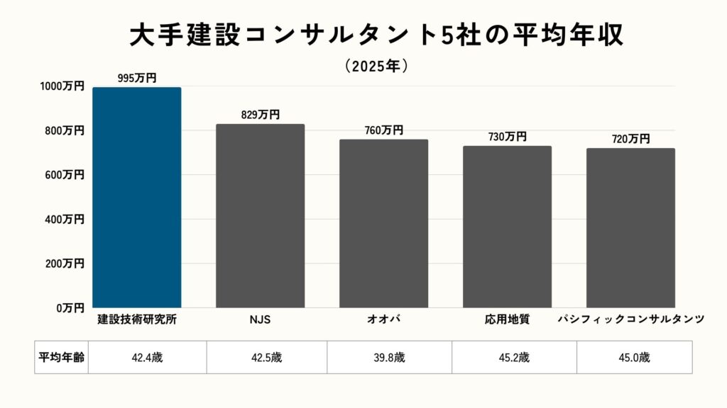 建設コンサルタント業界の大手5社で平均年収を比較すると、パシフィックコンサルタンツは約720万円で4位の水準です。1位の建設技術研究所(995万円)とは約275万円の差がありますが、平均年齢が45.0歳と最も高いことを考慮する必要があります。