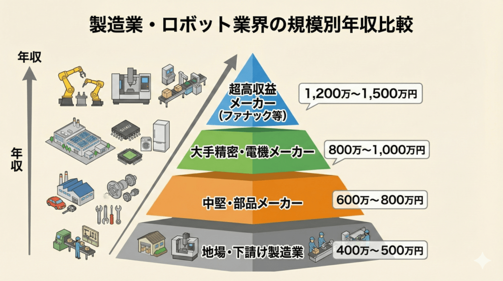 製造業全体で見ると、技術力、収益性、そして市場シェアによって年収に大きな差があります。