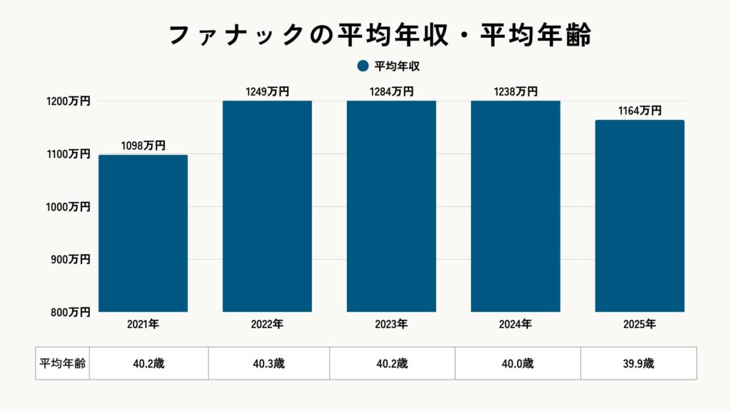 2021年から2025年の平均年収の推移を見ると、2023年の1,284万円をピークに直近2年は減少傾向にあります。これは業績連動型賞与の比率が高いファナックの特徴を反映しており、FA業界の市況変動が年収に影響しています。