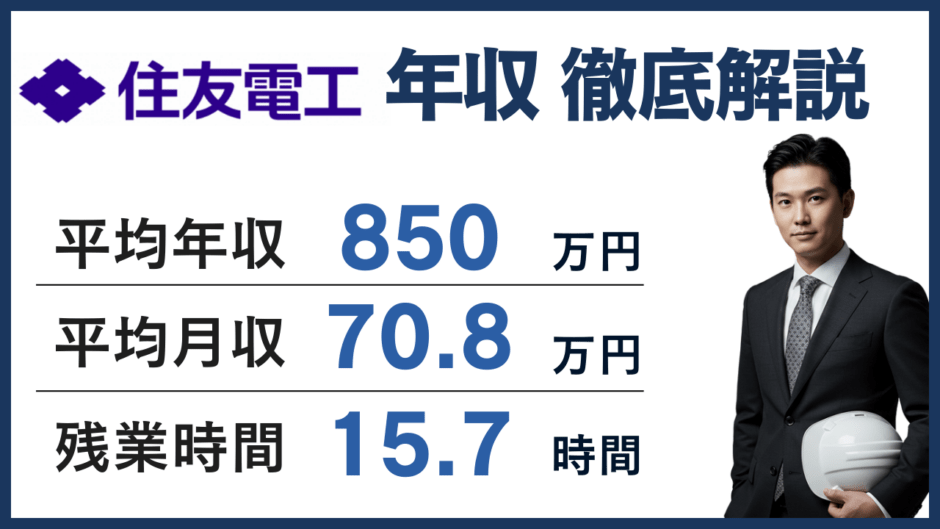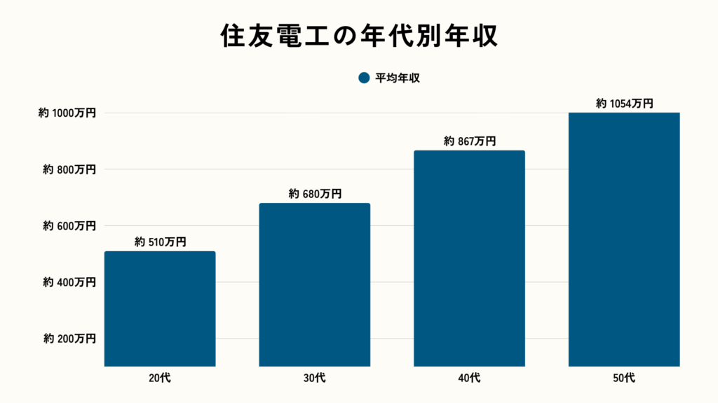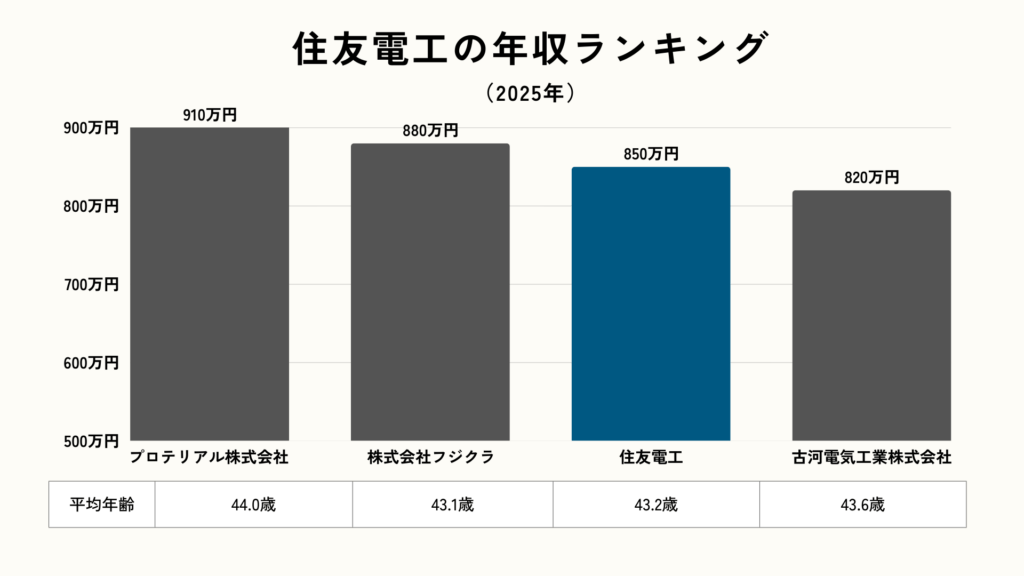 電線・非鉄金属メーカー主要4社の平均年収を比較すると、住友電工は850万円で3位に位置しています。プロテリアル(910万円)、フジクラ(880万円)にはやや及ばないものの、古河電気工業(820万円)を上回っており、同業界の中では安定して高水準の年収帯にあることが分かります。