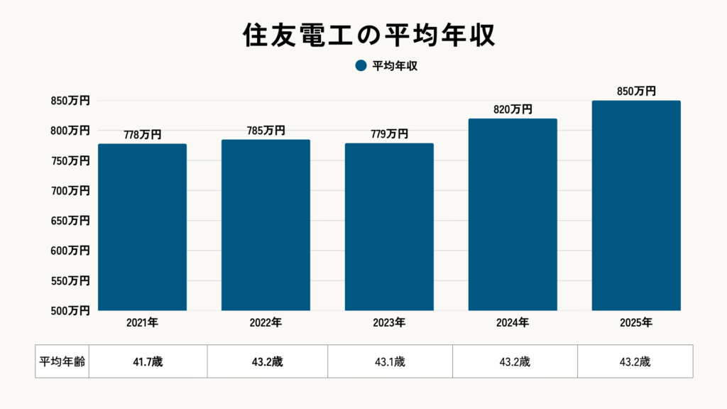 住友電工の平均年収は850万円、平均年齢は43.2歳と、国内大手メーカーの中でも高い給与水準に位置しています。社会インフラを支える事業を幅広く展開しており、40代前後の経験豊富な技術者層が中心となっている点が特徴です。