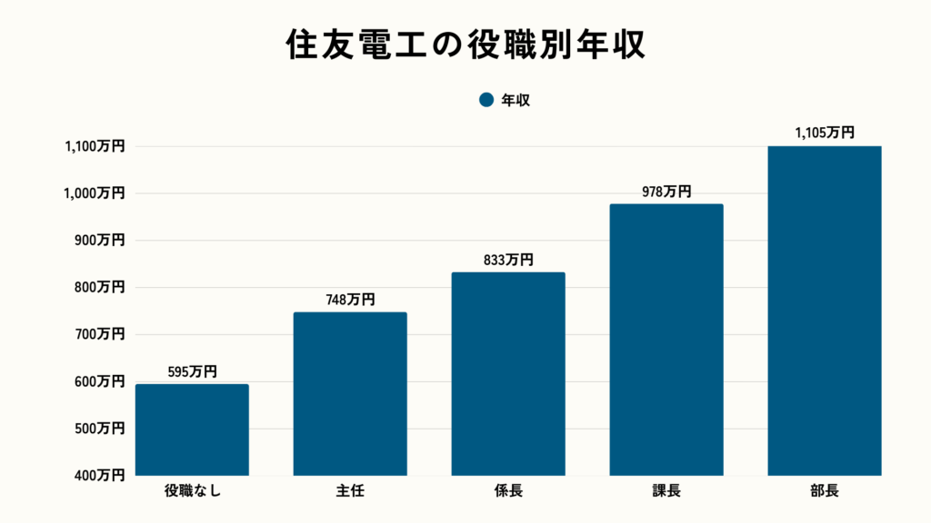 住友電工は、年次・役職・専門性に応じて年収が段階的に上昇する給与体系が特徴です。若手のうちから安定した昇給が続き、主任クラスで800万円台、課長クラスでは1,000万円超が現実的な水準となっています。役職が上がるほど責任は増しますが、それに見合った報酬が用意されている点は大きな魅力です。