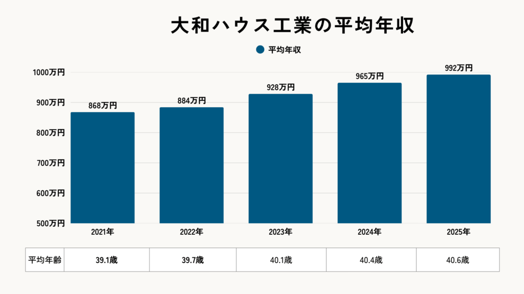 2021年から2025年にかけた平均年収の推移を見ると、2021年の868万円を起点に、毎年着実な上昇を続けていることが分かります。特直近の2025年には992万円と過去5年で最高水準を更新しています。2021年と比較すると、わずか4年間で約124万円増加しており、大和ハウス工業が中長期的に安定した報酬改善を進めていることが読み取れます。