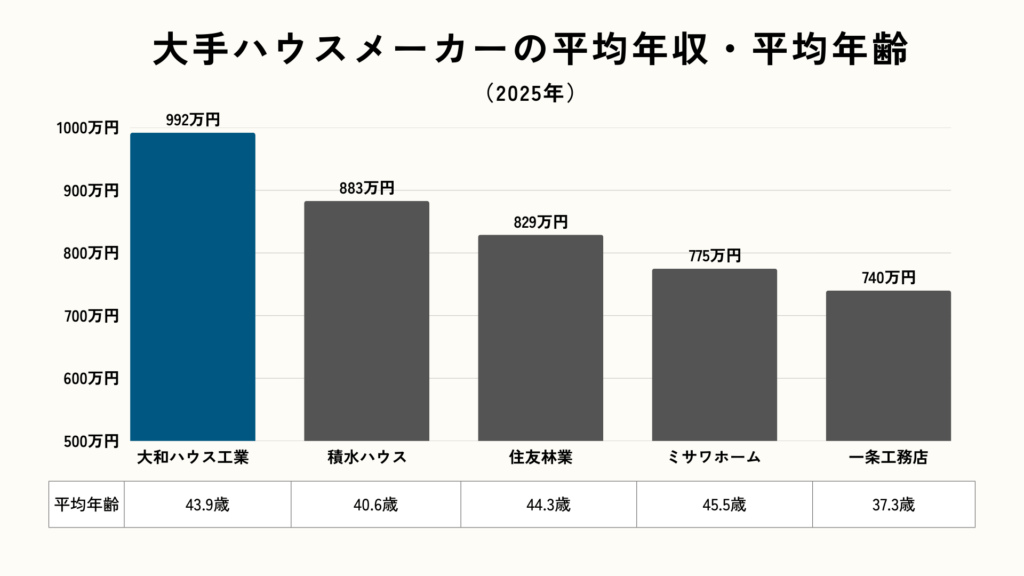 住宅メーカー5社の平均年収を比較すると、大和ハウス工業は992万円で1位に位置しています。2位の積水ハウスとは130万円、3位の住友林業とも160万円の差にとどまっており、上位企業間で高い給与水準を競い合っていることが分かります。