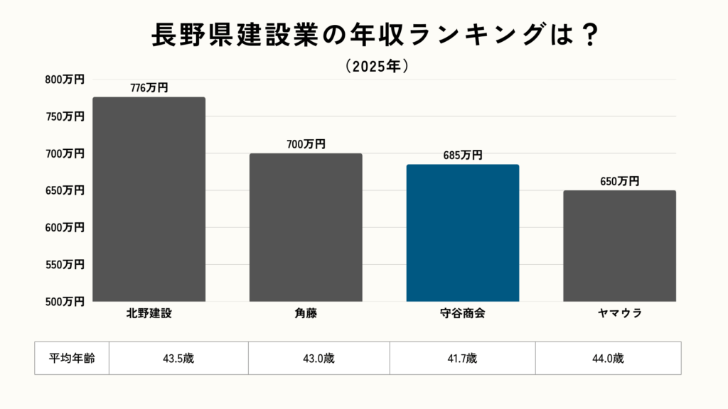 長野県に本社を置く主要建設会社の平均年収を比較すると、守谷商会は685万円で県内3位の水準です。北野建設(776万円)との差は約90万円ありますが、長野県の上場企業平均(585万円)と比較すると約100万円高い給与水準を維持しています。