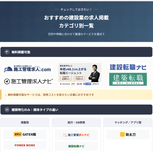 施工管理経験者を採用したい場合は、施工管理求人ナビや建設転職ナビなど、施工管理職に特化した媒体を選ぶのが効果的です。一方、若手の現場作業員を募集する場合は、助太刀社員やGATEN職など現場系求人に強いサイトが適しています。