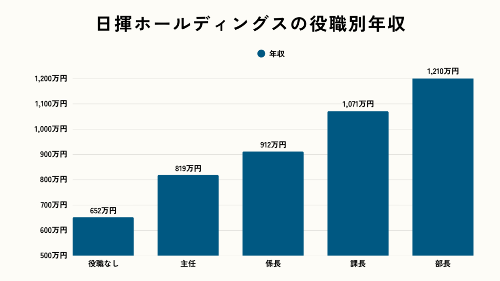 日揮ホールディングス株式会社は、設計から調達・建設までを一貫して担うEPC型エンジニアリング企業であり、給与体系も年次・役職・専門性に応じて段階的に積み上がる仕組みが特徴です。若手のうちから安定した昇給が続き、係長クラスで年収1,100万円超、課長クラスでは1,300万円前後に到達します。役職が上がるほど責任や裁量は増しますが、その分報酬水準も業界トップクラスに設定されています。