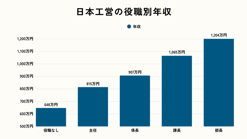 日本工営株式会社は、総合建設コンサルタント企業であり、給与体系は年次・役職・専門性に応じて段階的に上昇していく仕組みが特徴です。若手のうちから安定した昇給が続き、主任クラスで800万円台、課長クラスでは1,000万円超に到達します。役職が上がるほど責任や裁量は増しますが、それに見合った報酬水準が用意されている点は、業界内でも高く評価されています。