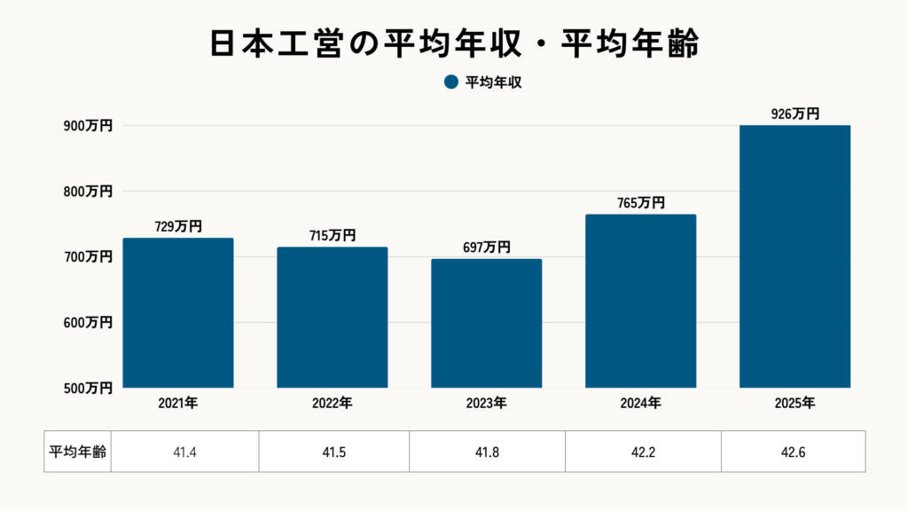 2021年から2025年までの平均年収推移を見ると、2021年は729万円、2022年は715万円、2023年は697万円と一時的に下落傾向が見られましたが、2024年には765万円へ回復し、2025年には926万円まで大きく上昇しています。直近の急伸は、業績改善や賞与水準の見直しが強く反映された結果と考えられます。5年間で見ると調整局面を経ながらも最終的には大幅な年収アップを実現しており、中長期的に高年収を狙える企業であることがうかがえます。