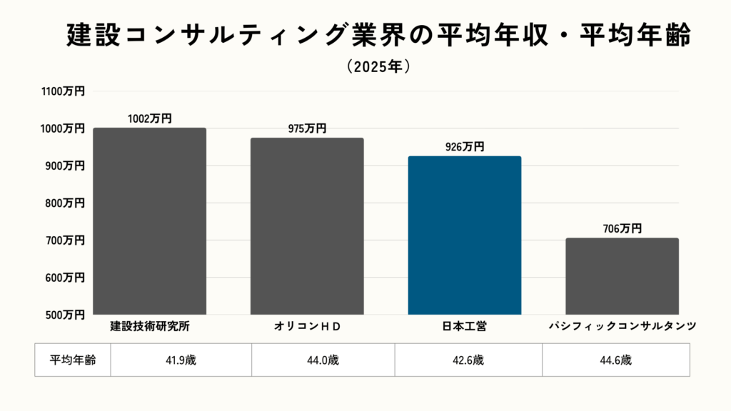 建設コンサルタント業界主要企業の平均年収を比較すると、日本工営株式会社は926万円となっており、業界内でも上位水準の年収帯に位置しています。建設技術研究所(1,002万円)やオリコンHD(975万円)といったトップクラスには一歩及ばないものの、パシフィックコンサルタンツ(706万円)を大きく上回っており、建設コンサル業界の中では安定して高年収が期待できる企業であることが分かります。